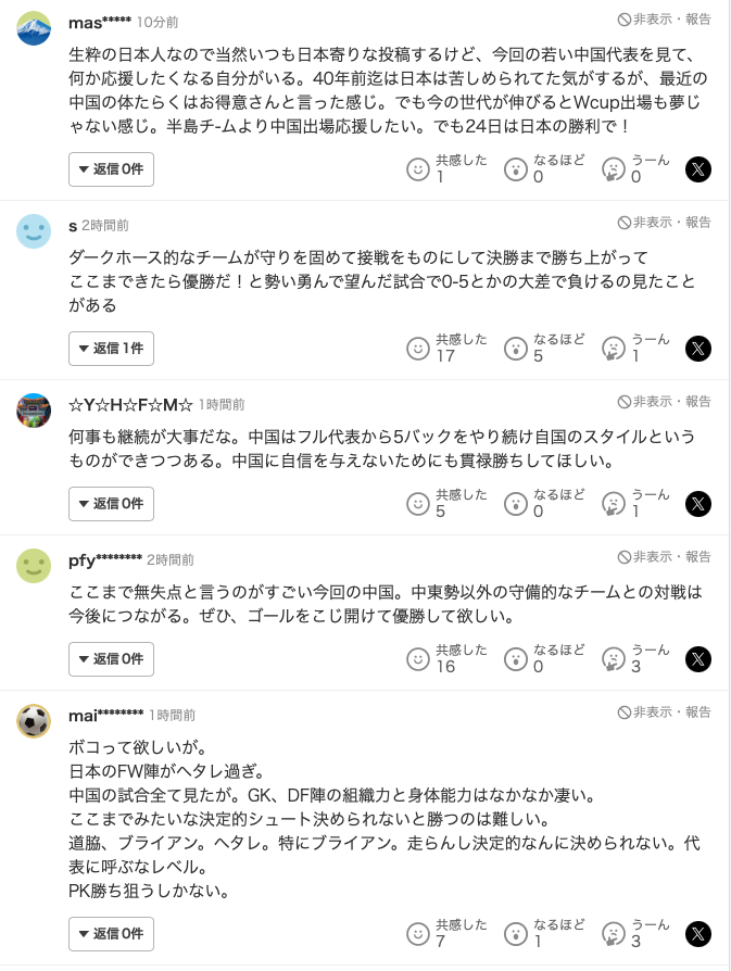也有球迷表示:“作为一个日本人,当然是偏向日本队的,但是看到这支年轻的中国队,不知道为什么有点想给他们加油。大概40年前,日本队还很难和中国队抗衡,这也算是我们的‘老对手’了。感觉这批年轻人成长起来的话,中国队进世界杯也不再是梦了。相比起韩国,我更希望中国队能进世界杯。不过24号的决赛,还是希望日本队获胜!”